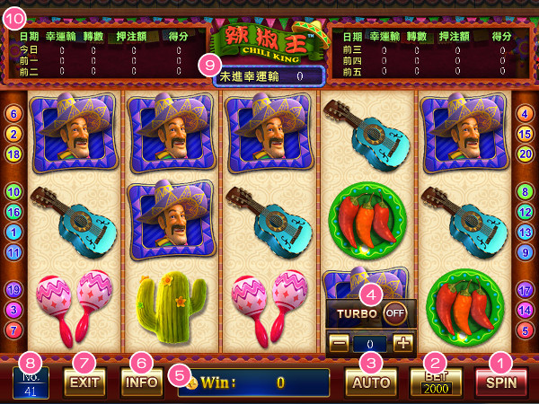 - 離開按鈕(EXIT):返回到機台大廳;若在遊戲進行中,該按鈕將反灰,此時您無法離開遊戲。